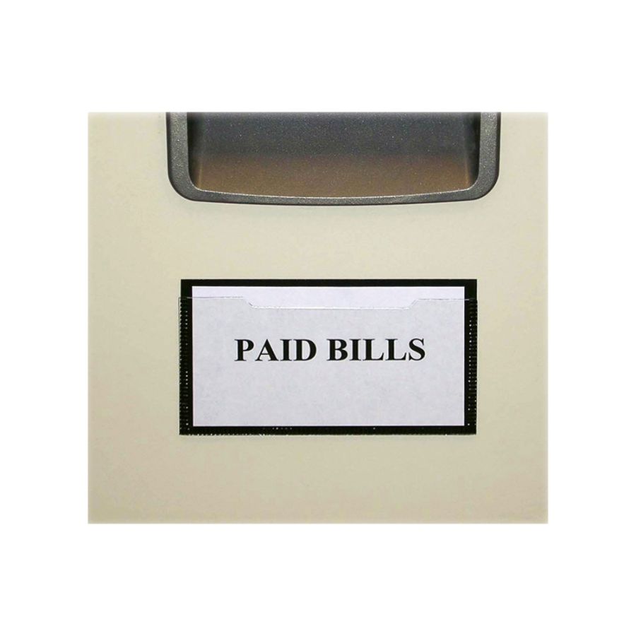 Self adhesive and magnetic label holders create clear organization of storage and shelving for home and office applications. Pack of 10 white vinyl and clear magnetic label holders for file cabinets.