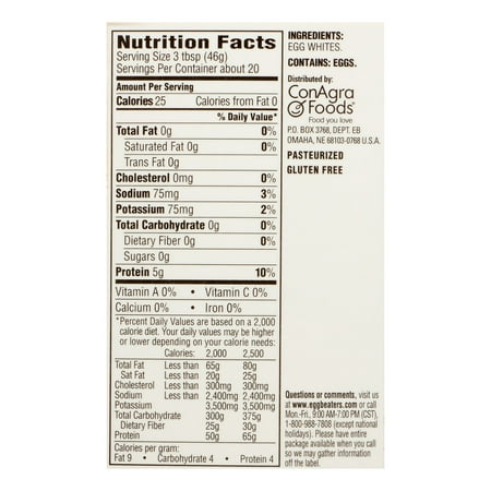 Egg beater nutrition label. Youd need to walk 8 minutes to burn 30 calories. There are 25 calories in a 3 tbsp serving of egg beaters all natural 100 egg whites. Protein 6g there are 33 calories in a 14 cup serving of egg beaters egg beaters original.
