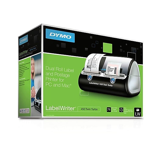 Dymo labelwriter 450 twin turbo label thermal printer for pc and mac. The dymo labelwriter 450 twin turbo features two rolls of labels ready to print at all times enhancing efficiency by allowing you to print address labels and postage without swapping label rolls and prints up to 71 four line standard address labels per minute for maximum productivity. The dymo labelwriter 450 turbo and 450 twin turbo use exactly the same labels.