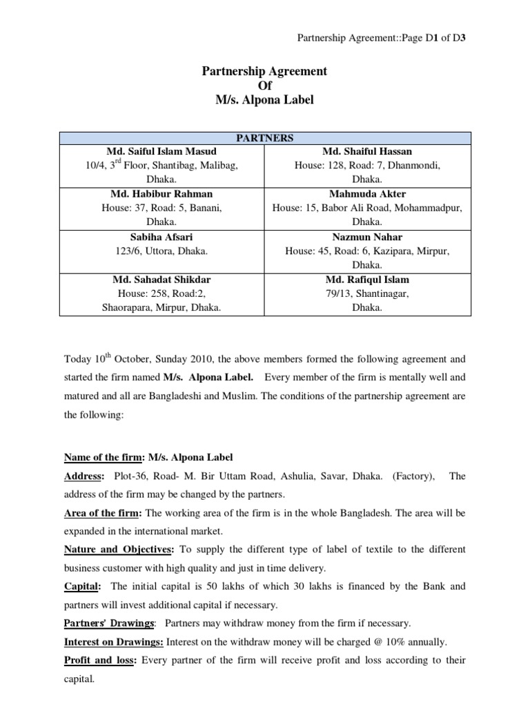 Partnership Agreement Dhaka Partnership