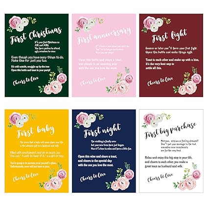 You can split the cost of 8 bottles of wine at least one should be champagne and then add a poem gift tag to each bottle so the bride has a wine collection ready for the milestones of her first year of marriage. First christmas bottle wine. First year of marriage milestones with love in mind.